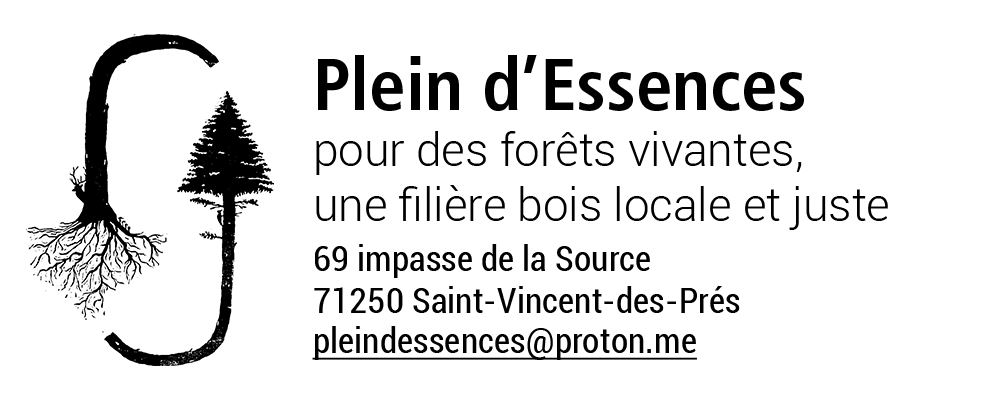 L’association Plein d’Essences est née en octobre 2022 dans le clunisois. Son objet social est de créer une organisation collective de proximité qui vise à répondre à des besoin locaux en bois tout en respectant une éthique sociale forte et préservant les écosystèmes forestiers, ainsi que de cheminer vers une gestion démocratique de la ressource naturelle qu’est le bois par une gouvernance en intelligence collective, incluant la forêt et l’ensemble du vivant.